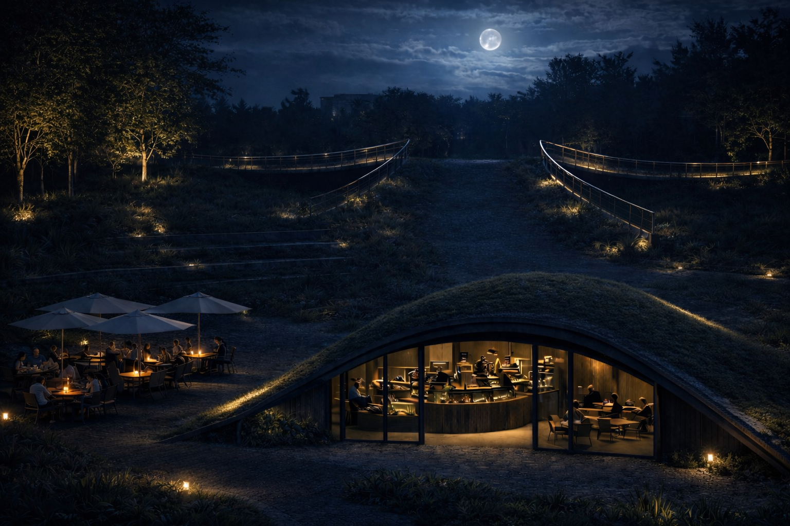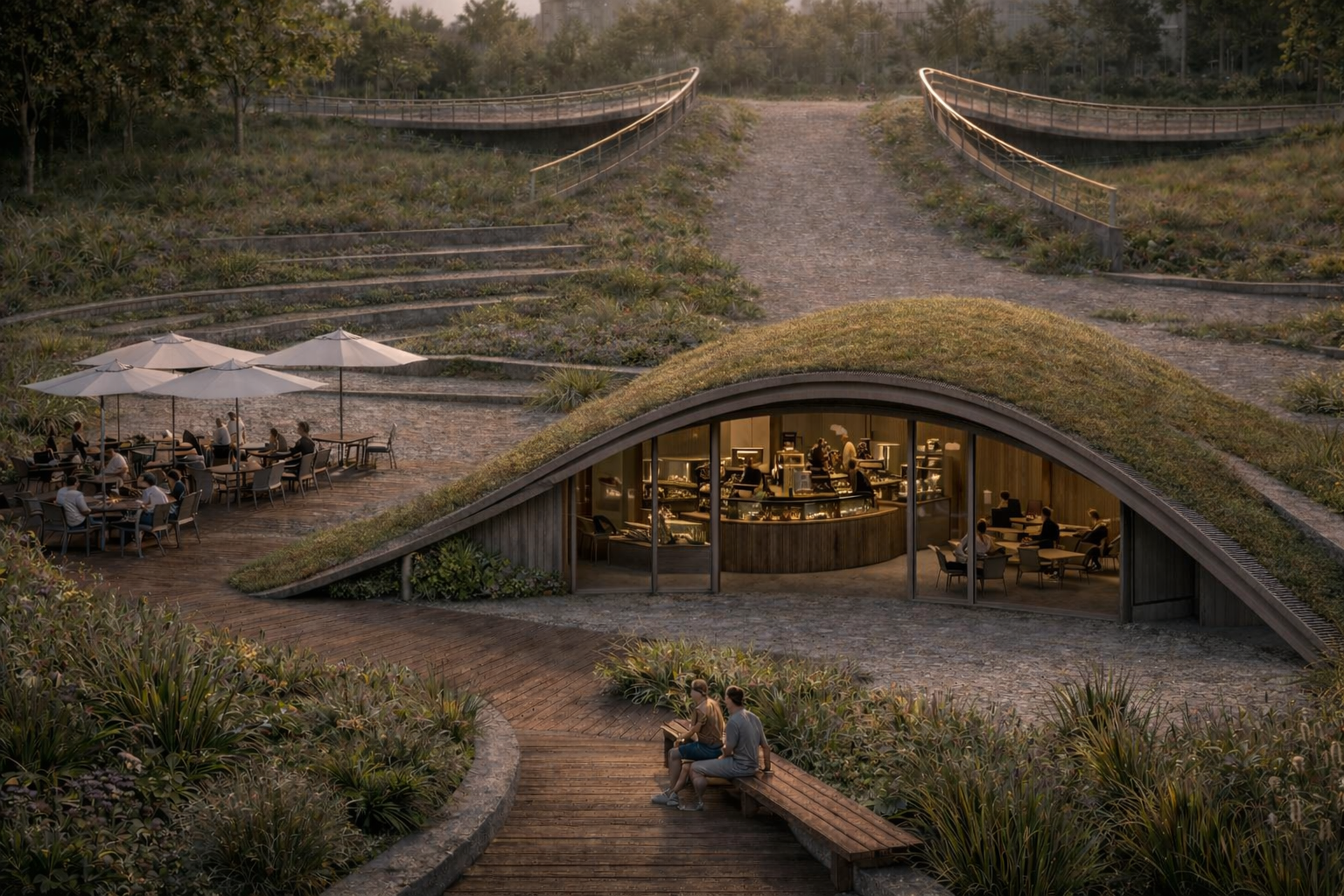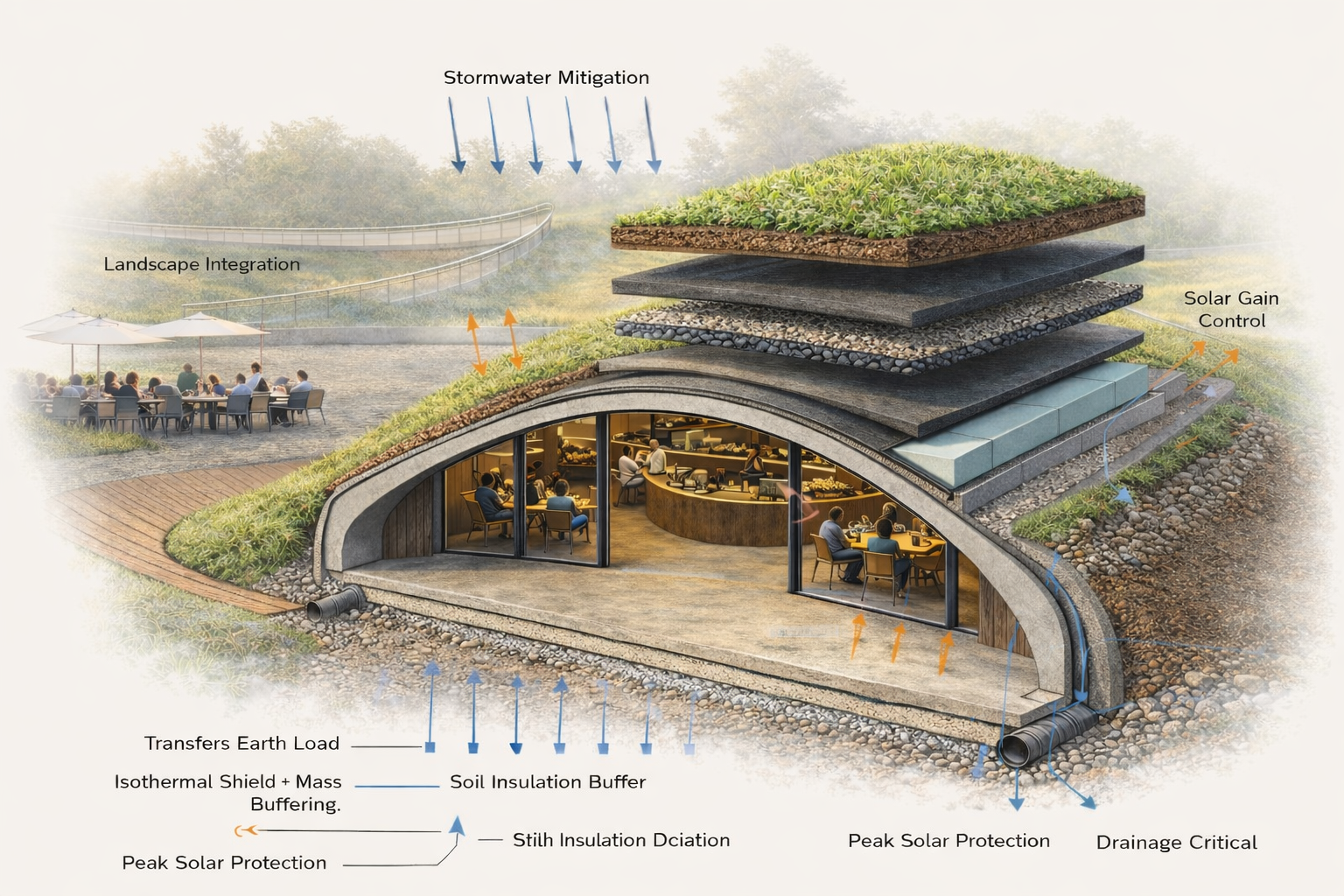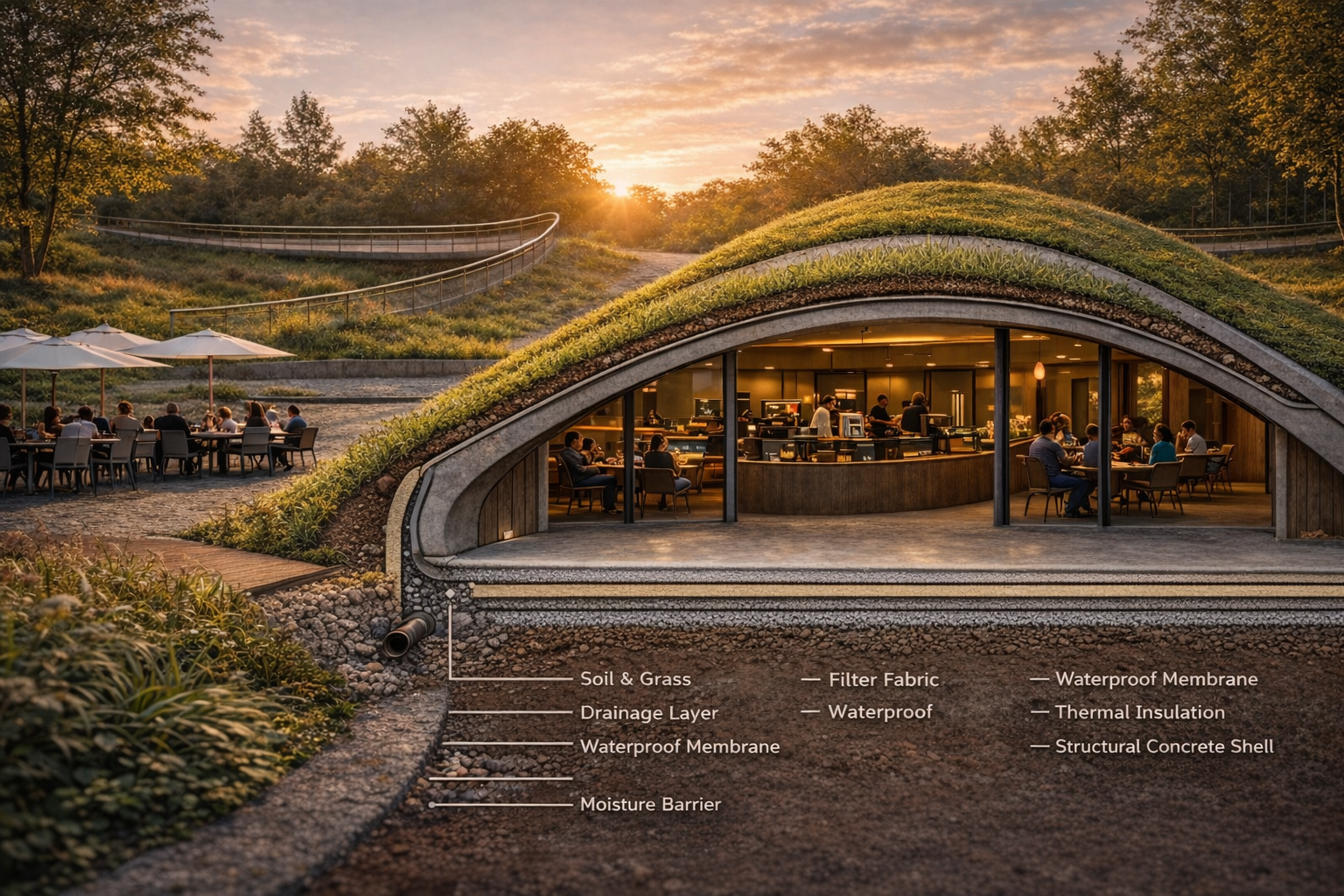 Utilizing the high thermal mass of engineered soil and a vegetated “shell,” the building achieves natural temperature regulation. This living roof buffers the interior café from external fluctuations, reducing the mechanical cooling load in summer and retaining geothermal warmth in winter.