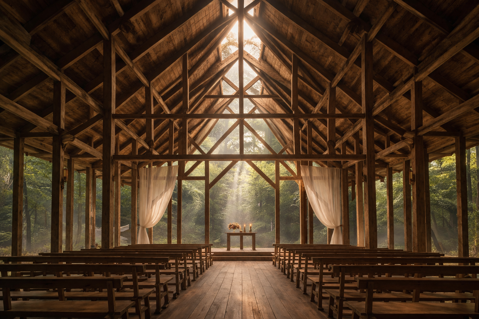 Inspired by the tectonic clarity of Fay Jones’ Thorncrown Chapel, the architecture is conceived not as an object of spectacle, but as a place where atmosphere, structure, and light gently blur the boundary between the real and the imagined.